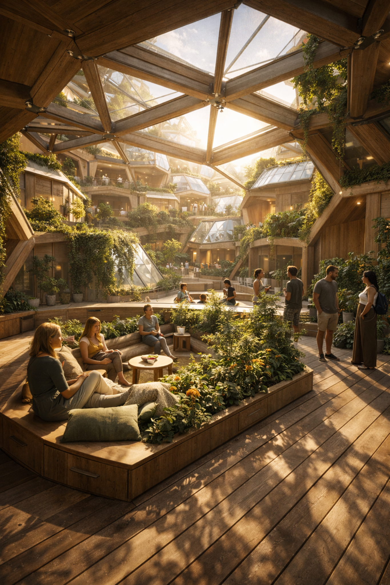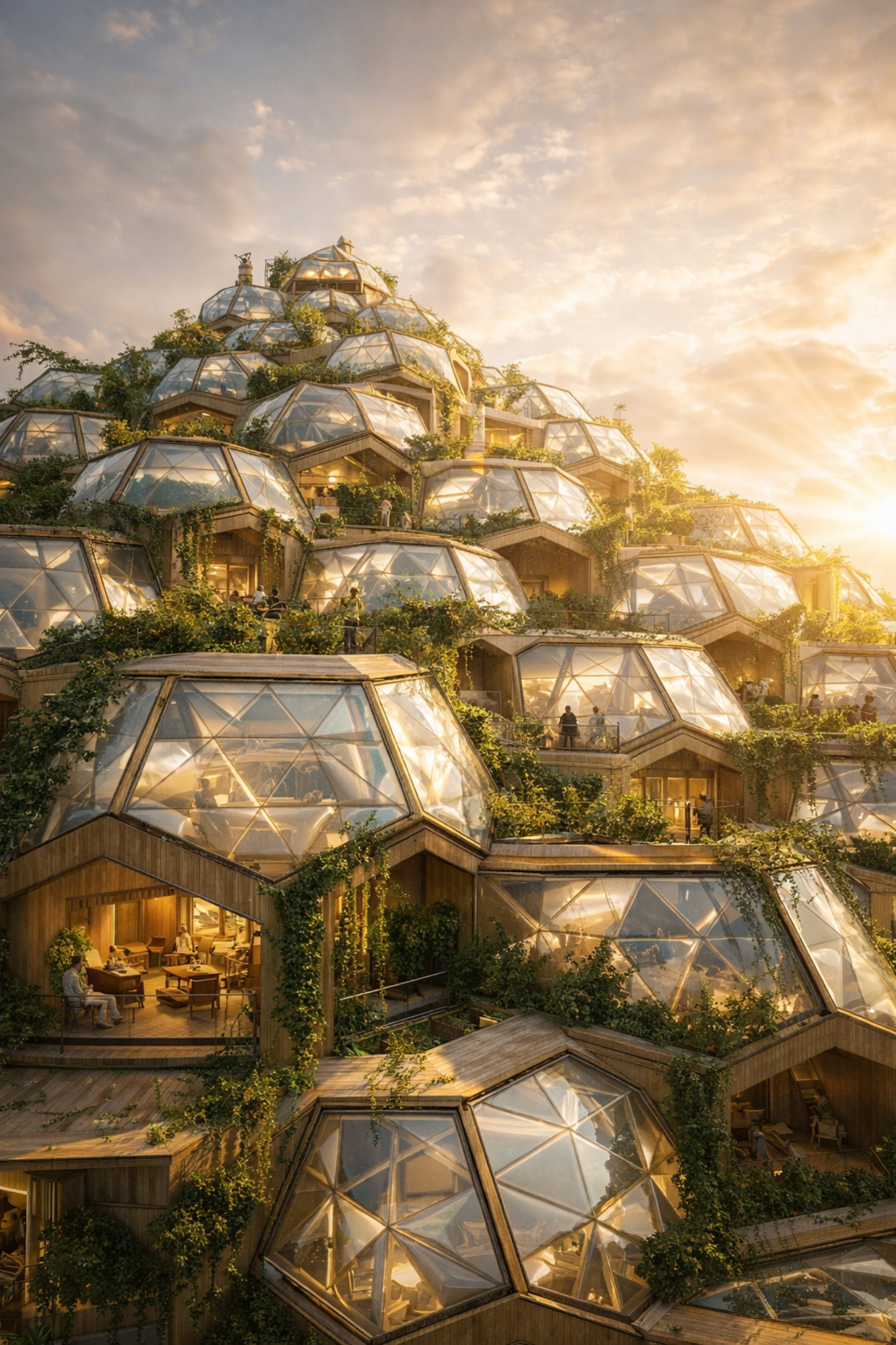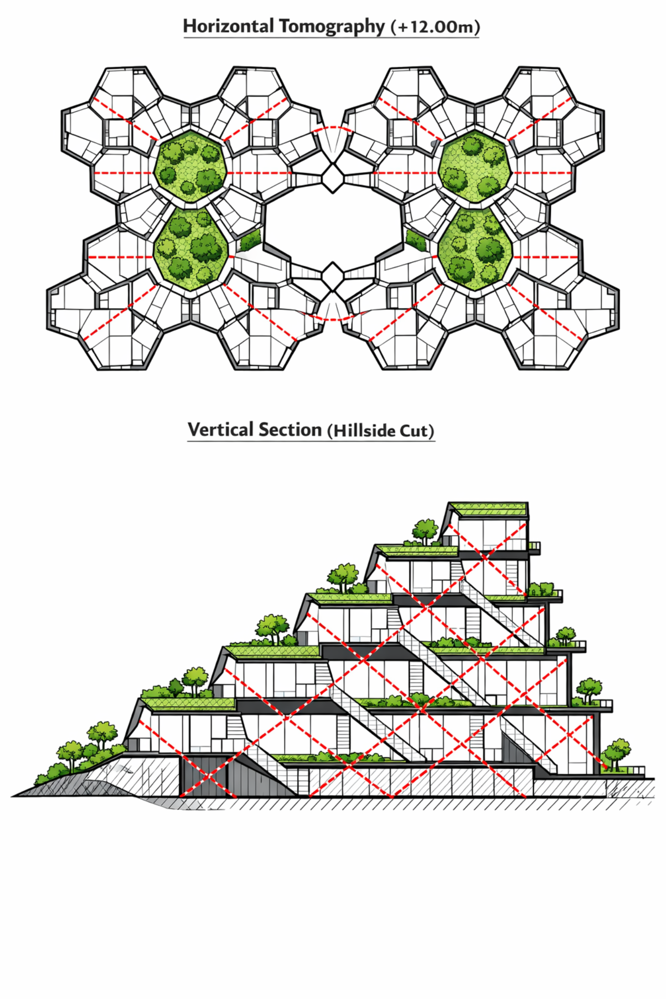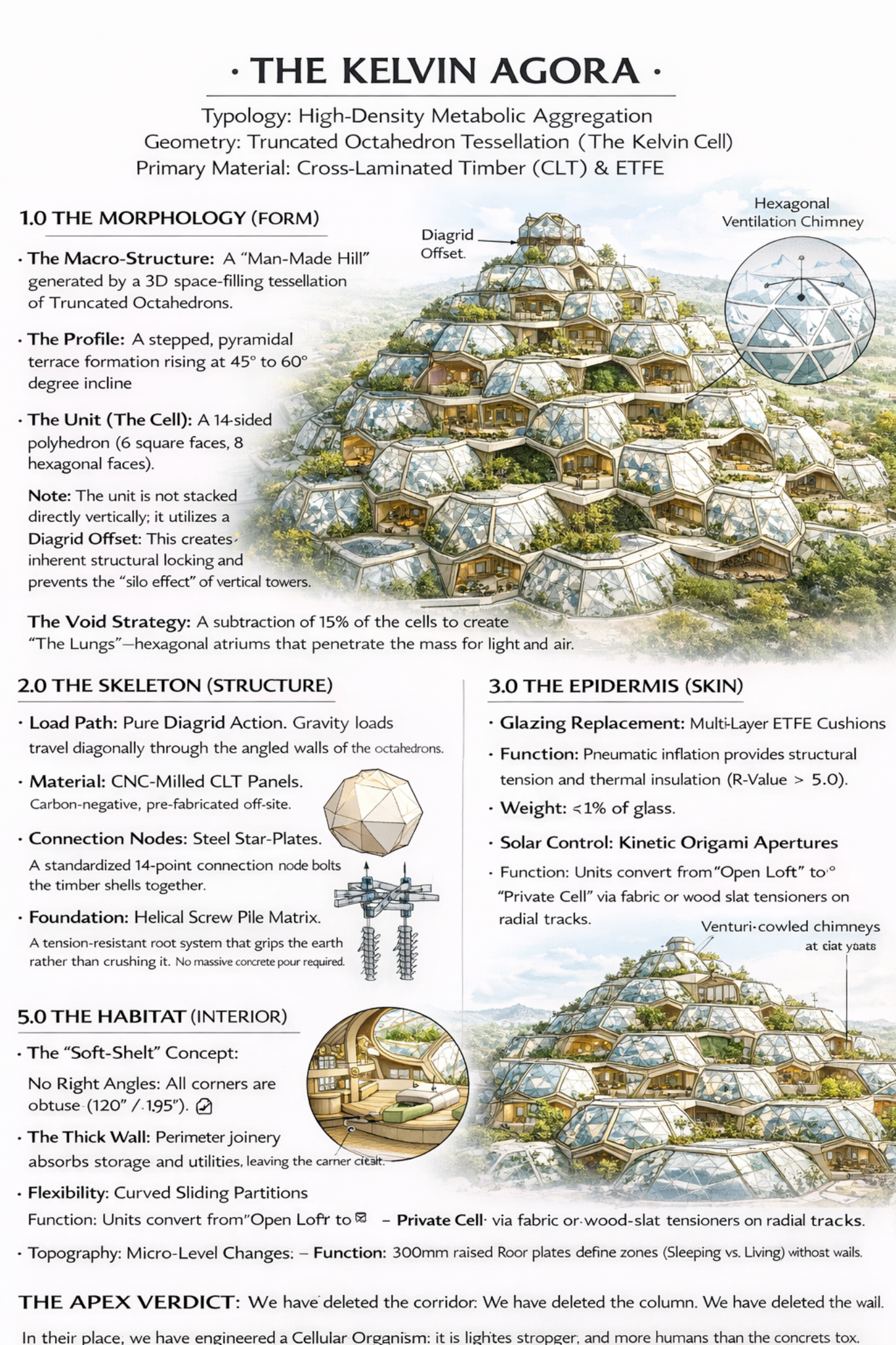 The first pass through the system produced a non-cubic aggregation of truncated octahedrons, supported by mass timber diagrid logic, terraced social lattices, passive stack ventilation, and ETFE communal atriums.
